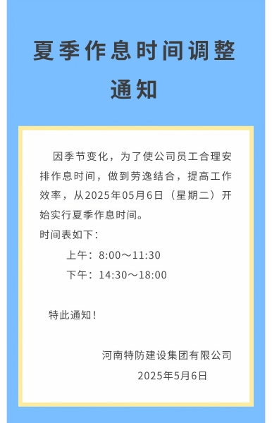 九游(中国)集团夏季作息时间调整