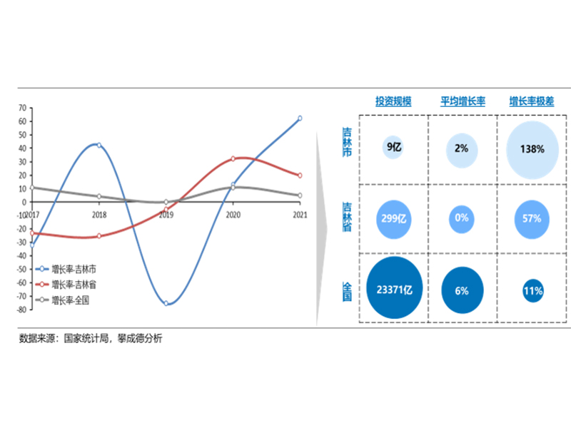 说明:吉林市投资增长率2021年达到最高62%,2019年最低为-76%,极差为138%;吉林省投资增长率2020年达到最高32%,2018年最低为-25%,极差为57%;全国投资增长率2020年达到最高11%,2019年最低为0%,极差为11%。